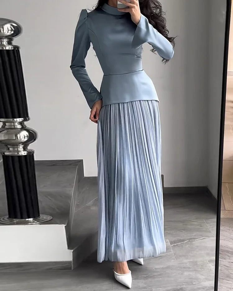 La falda larga plisada, confeccionada en gasa satinada de caída natural, aporta un contraste exquisito con la estructura superior. Cada pliegue se mueve con gracia, capturando la luz y otorgando dinamismo al conjunto sin perder formalidad. Su diseño fluido estiliza la figura y genera una sensación de movimiento continuo y etéreo.