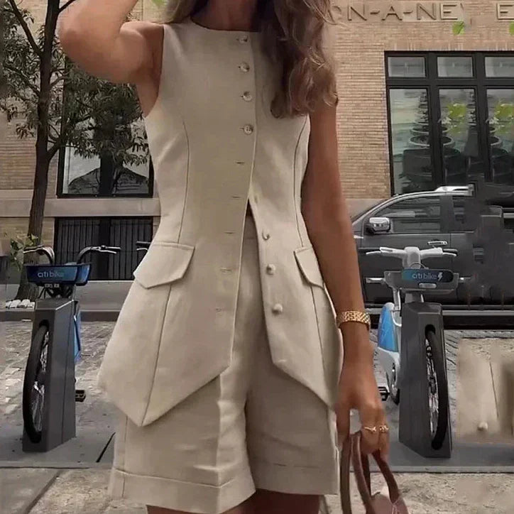 El Bexley™ Conjunto de Chaleco y Pantalón Corto se distingue por su diseño fresco y estructurado. Confeccionado con materiales de alta calidad, este conjunto ofrece un ajuste cómodo y favorecedor. El chaleco bien cortado añade un toque sofisticado, mientras que los pantalones cortos aportan frescura y dinamismo, haciéndote sentir única y especial.