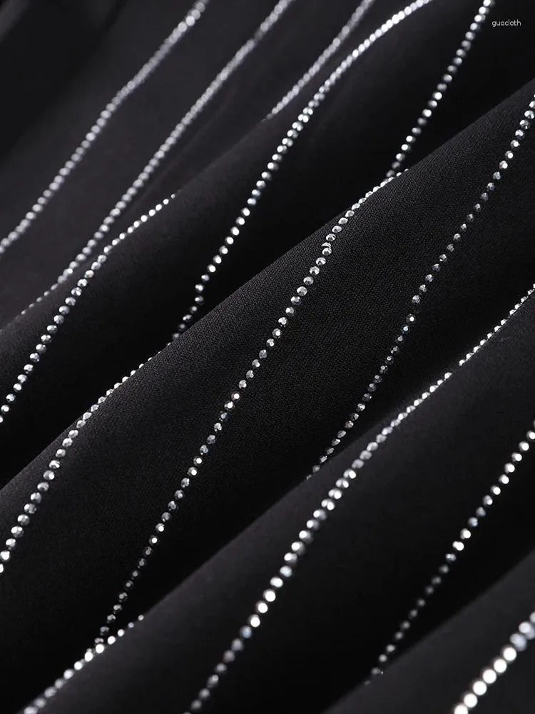 Luce un estilo sofisticado con este conjunto negro de líneas verticales blancas. Su diseño favorecedor estiliza la figura y combina comodidad con un toque de lujo para cualquier ocasión.