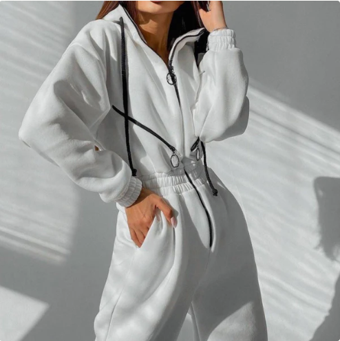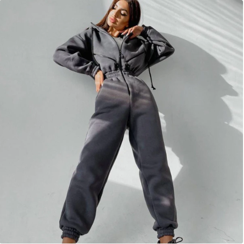 Su chaqueta con cierre frontal y cordones ajustables en cintura permite definir la silueta y crear un look estilizado sin esfuerzo. El pantalón de tiro alto con elástico aporta comodidad y estructura, mientras los detalles en negro añaden un contraste moderno y sofisticado. Cada elemento del conjunto está pensado para ofrecer libertad de movimiento, suavidad y una caída impecable.