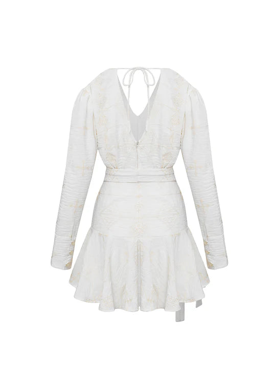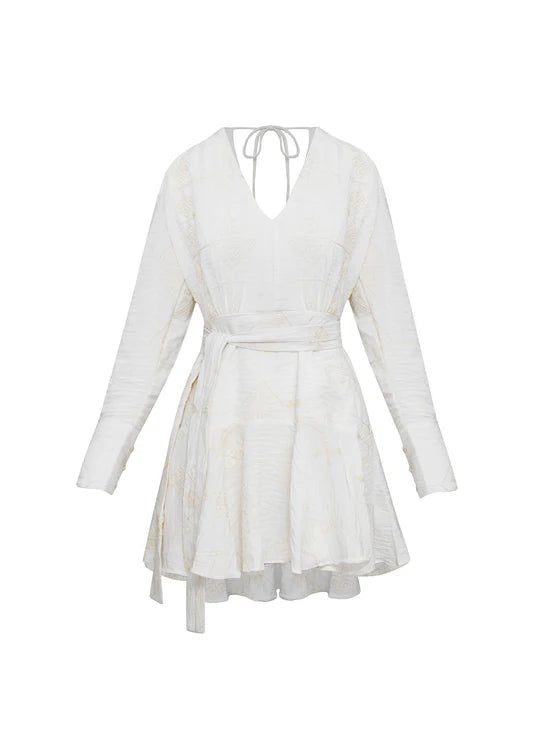 La falda, con un delicado vuelo en corte evasé y detalles de paneles, añade movimiento y frescura al caminar, evocando una feminidad natural y contemporánea. El largo mini lo convierte en una opción ideal para eventos de día, celebraciones al aire libre o escapadas sofisticadas bajo el sol.