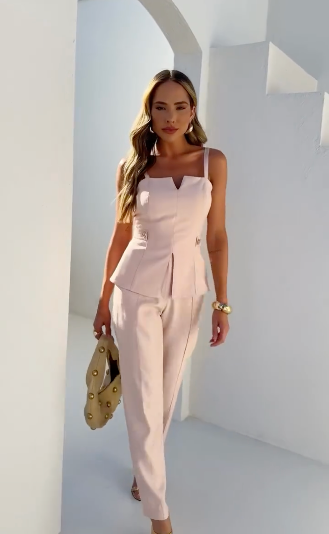 El corset estructurado abraza la silueta con precisión, destacando la cintura y realzando la figura con un aire contemporáneo. Su diseño con escote cuadrado y detalle frontal crea un equilibrio perfecto entre sensualidad y sofisticación. El pantalón de corte recto aporta el toque de sobriedad ideal, alargando la figura y manteniendo una caída fluida que acompaña cada paso con naturalidad.