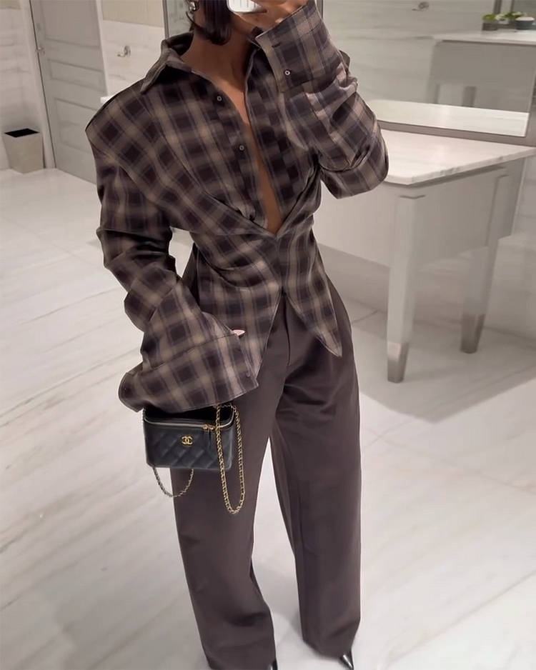 El conjunto Harper redefine la sastrería femenina con un equilibrio perfecto entre fuerza y sofisticación. Su diseño se compone de una camisa entallada de cuadros con corte estructurado y pinzas que realzan la silueta, acompañada de pantalones de caída fluida que aportan movimiento y armonía al conjunto.