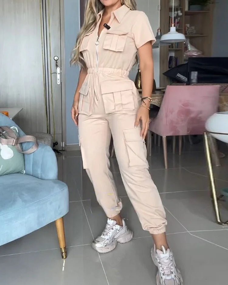 Lapel Short Sleeve Solid Color Waisted Casual Jumpsuit