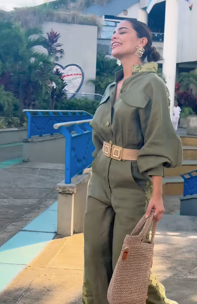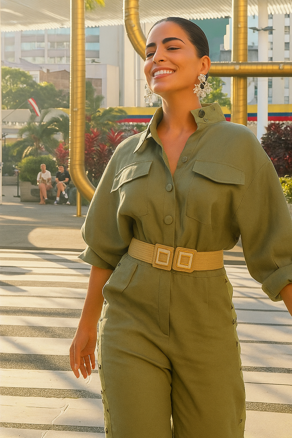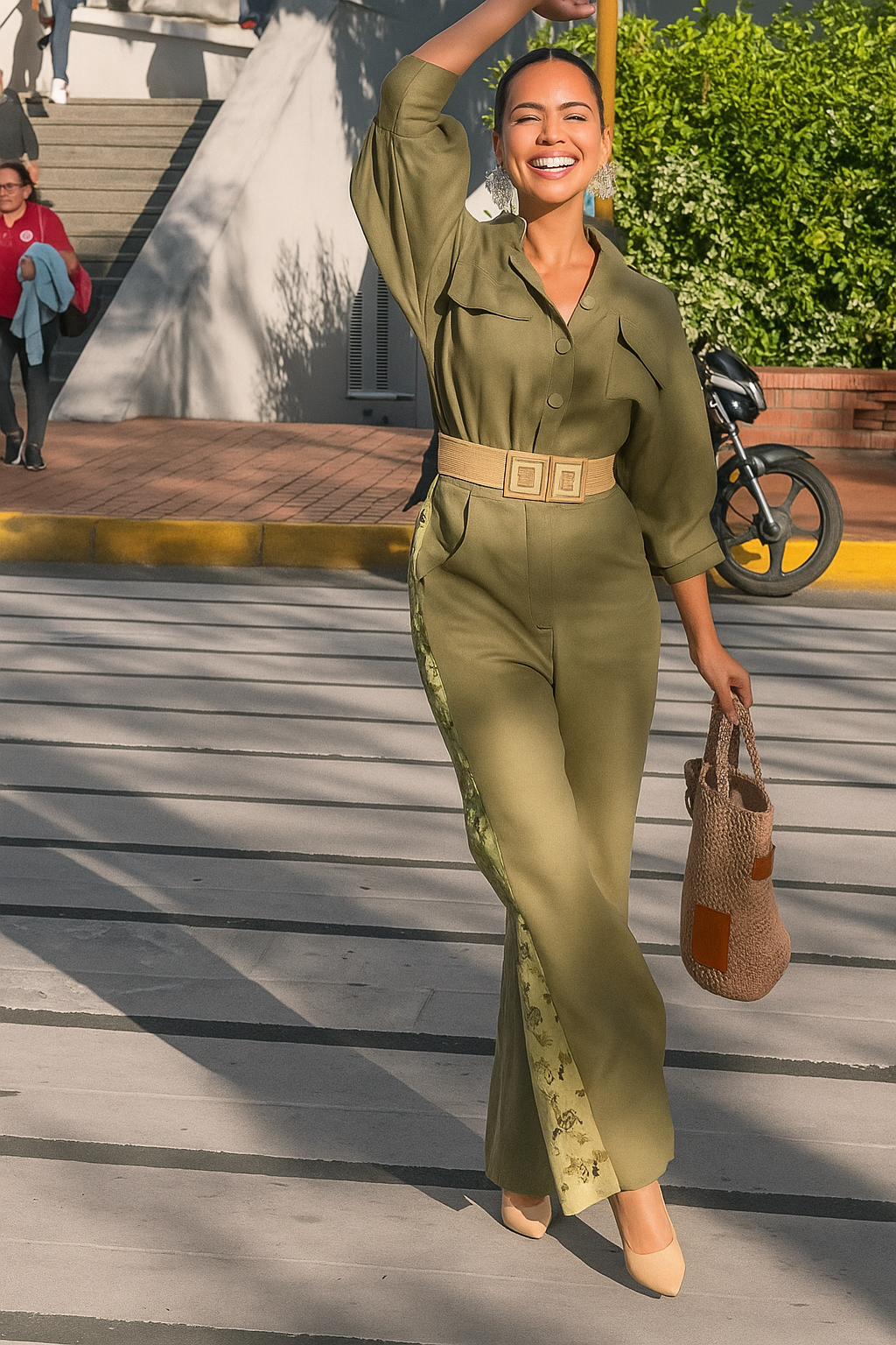 Confeccionado en un tono verde oliva cálido y sofisticado, este jumpsuit presenta un corte ceñido a la cintura gracias a un cinturón ancho que acentúa la silueta y resalta el porte con elegancia. Sus mangas tres cuartos de caída fluida y bolsillos delanteros le otorgan una esencia relajada pero con intención, ideal para un look de impacto sin esfuerzo.