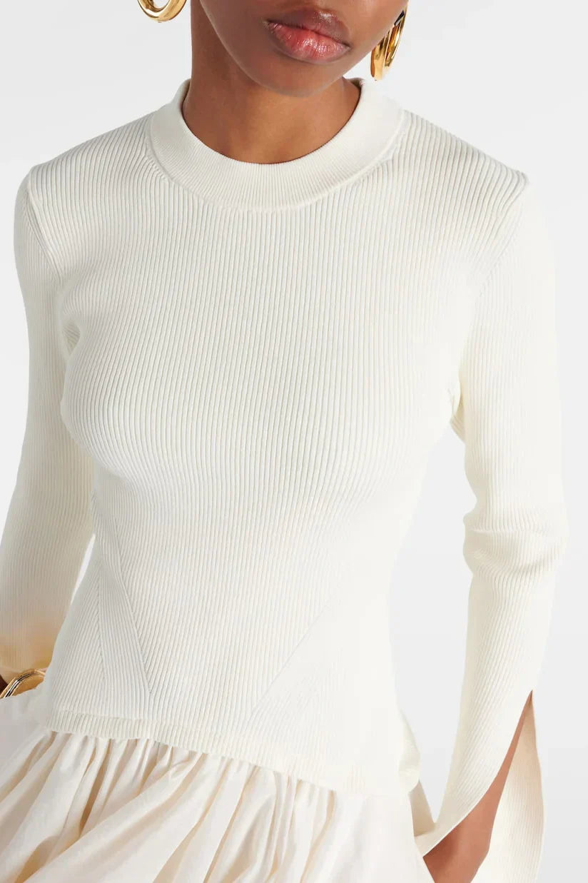 Combinando diferentes tejidos para un efecto de técnica mixta, el vestido presenta una divertida falda de burbujas que agrega volumen y estilo. El corpiño ajustado ofrece un elegante contraste que acentúa la cintura, mientras que el diseño sin mangas y el largo midi crean una silueta refinada y moderna. Perfecto para eventos especiales, este vestido combina sofisticación con un toque de diversión.
