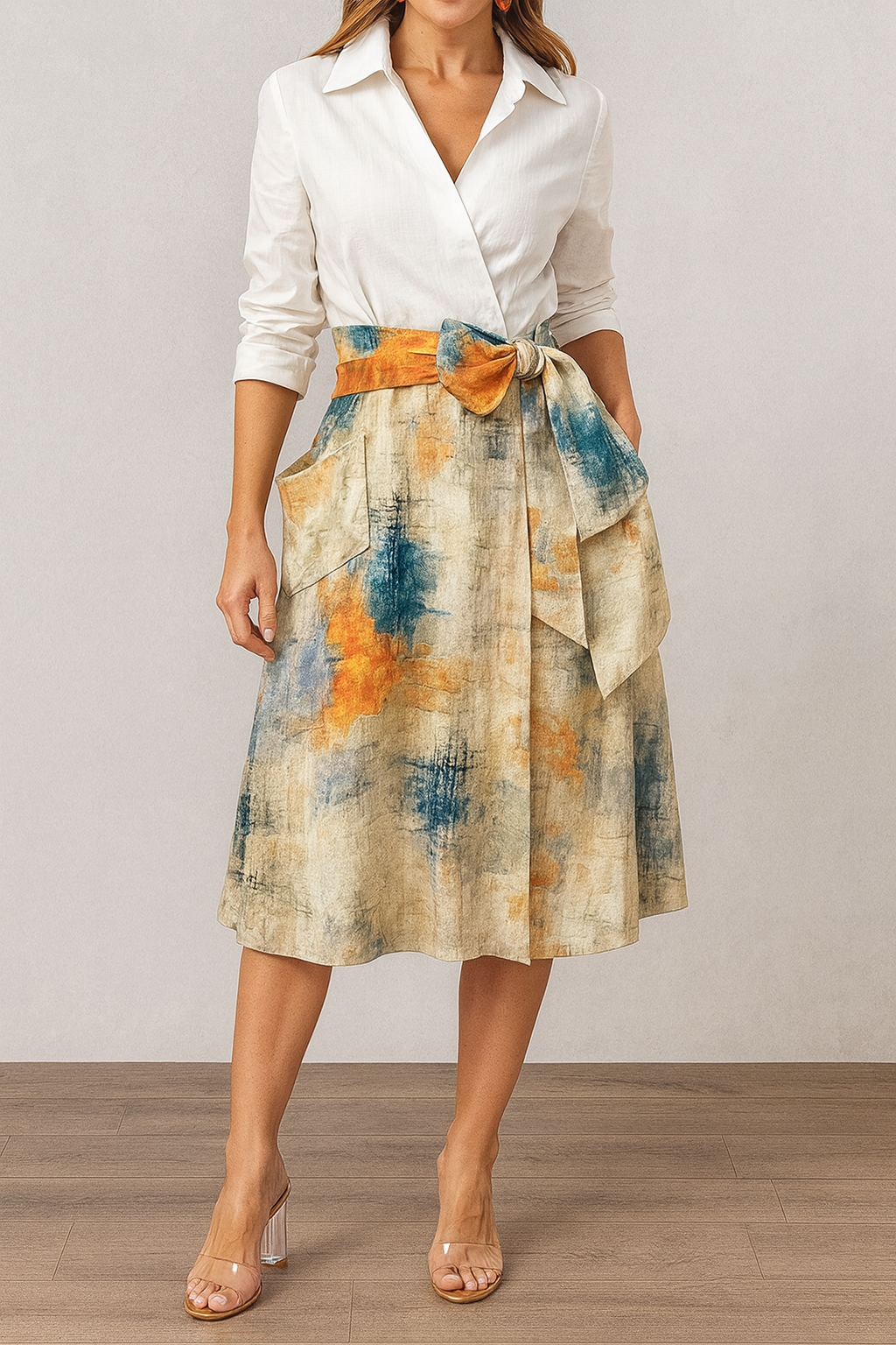 Diseño dos piezas: blusa blanca envolvente y falda midi con cinturón anudado.