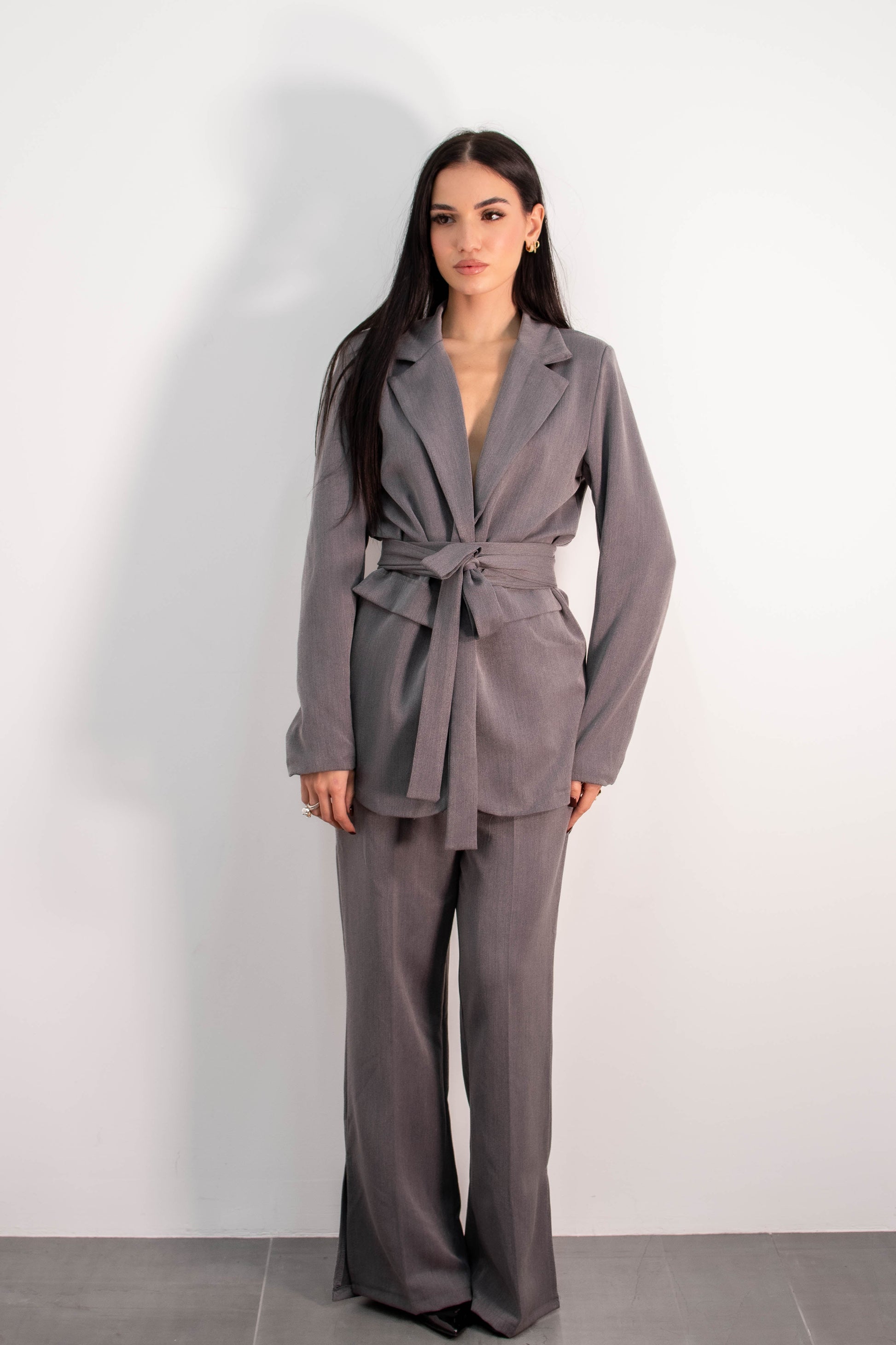 Este conjunto negro con blazer cruzado y cinturón marca la silueta con elegancia, mientras el pantalón fluido aporta movimiento y comodidad.